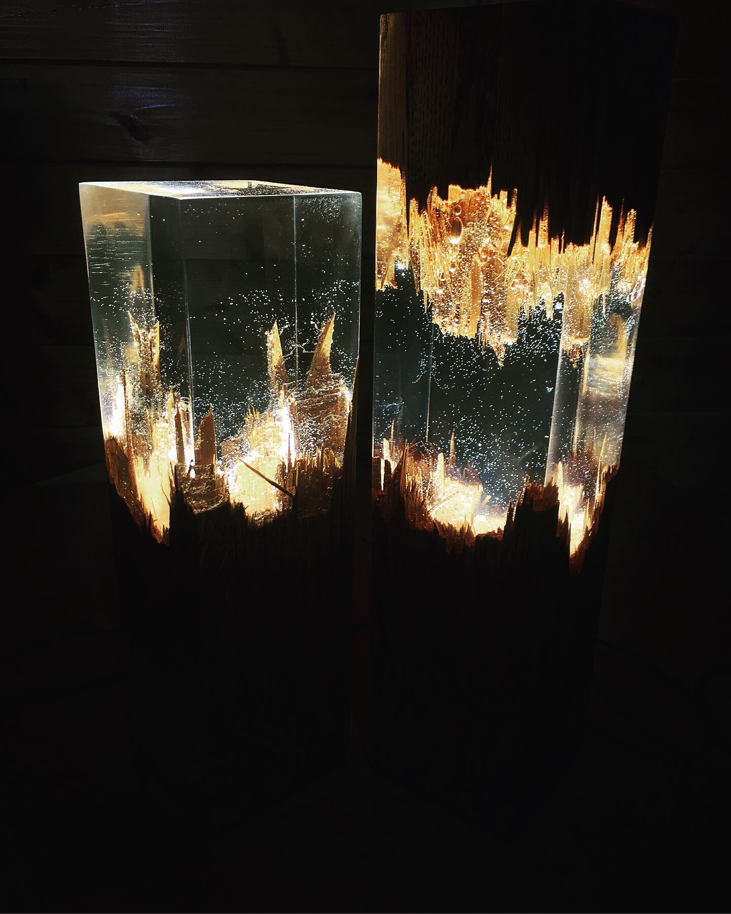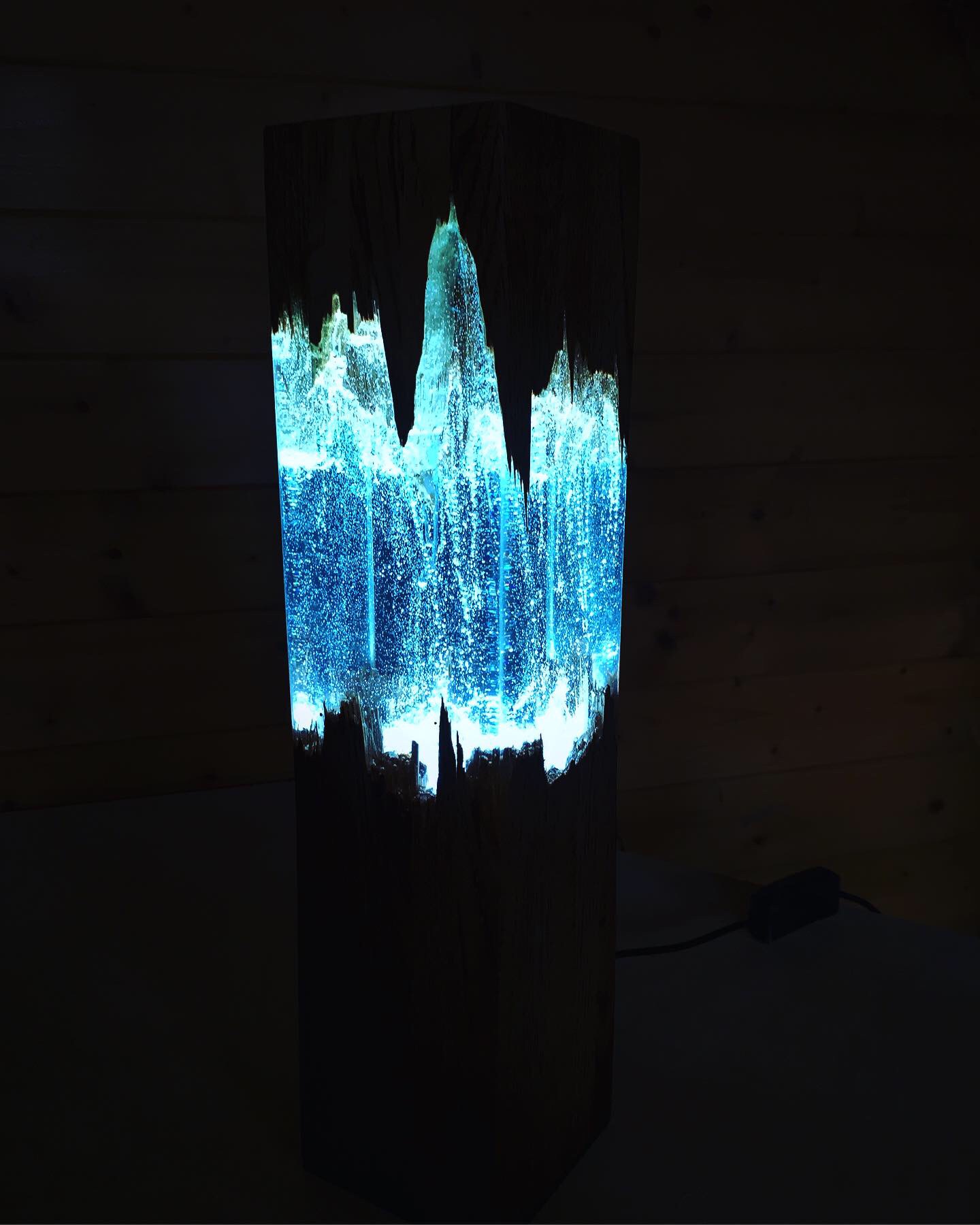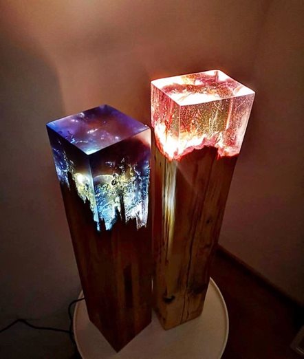 Výroba dekoračních lamp za použití dřeva a pryskyřice.
