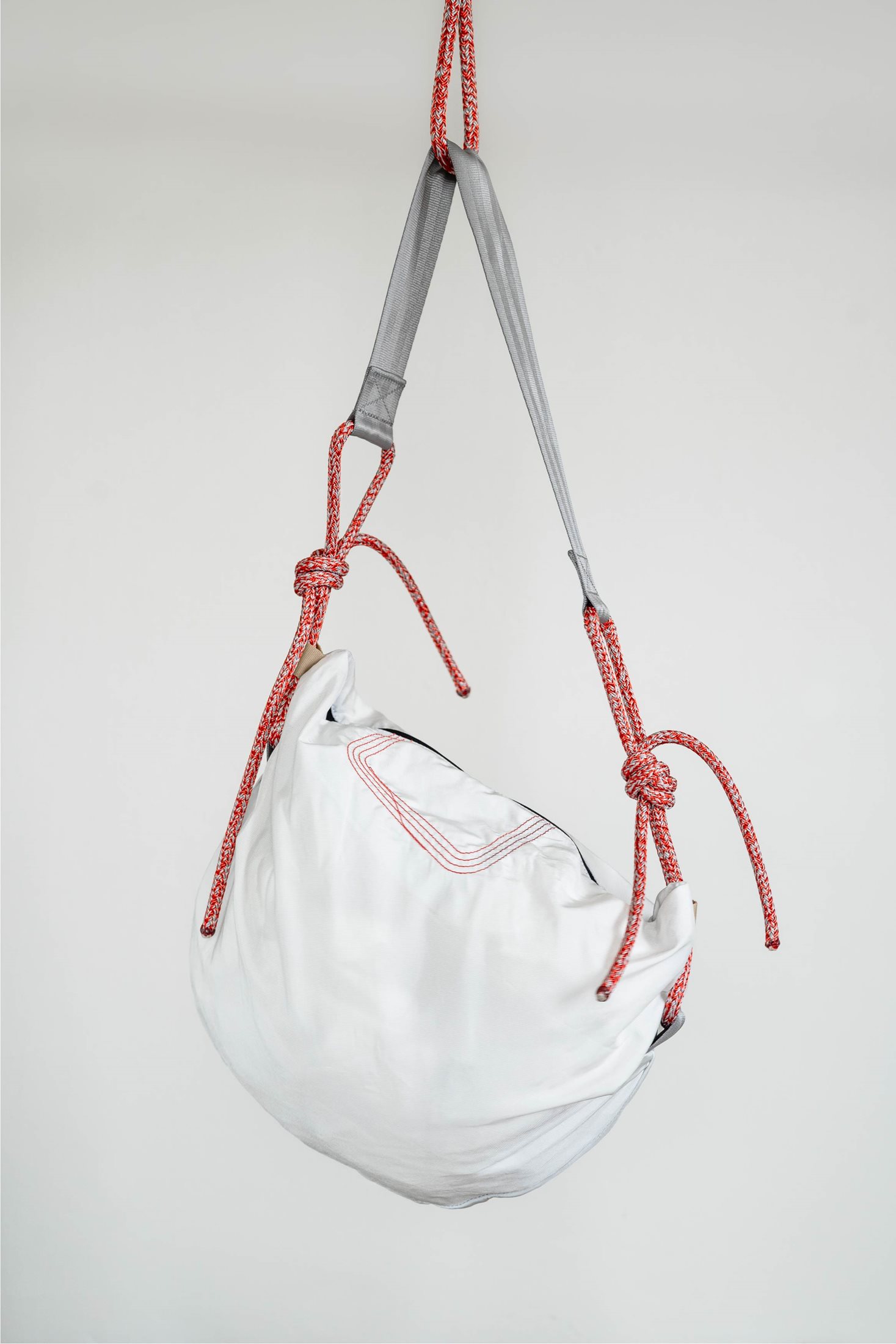 Na ostatní části tašek maximálně používáme zbytky z výroby nebo materiál, který by jinak skončil ve spalovnách. Popruhy šijeme z bezpečnostních pásů (které také získáváme z vrakovišť) podšívky šijeme z vyřazených plachet nebo zbytků z balónů, tenčí popruhy jsou vyřazené popruhy od firmy Ocún, lana jsou zbytkový materiál od firmy Lanex...