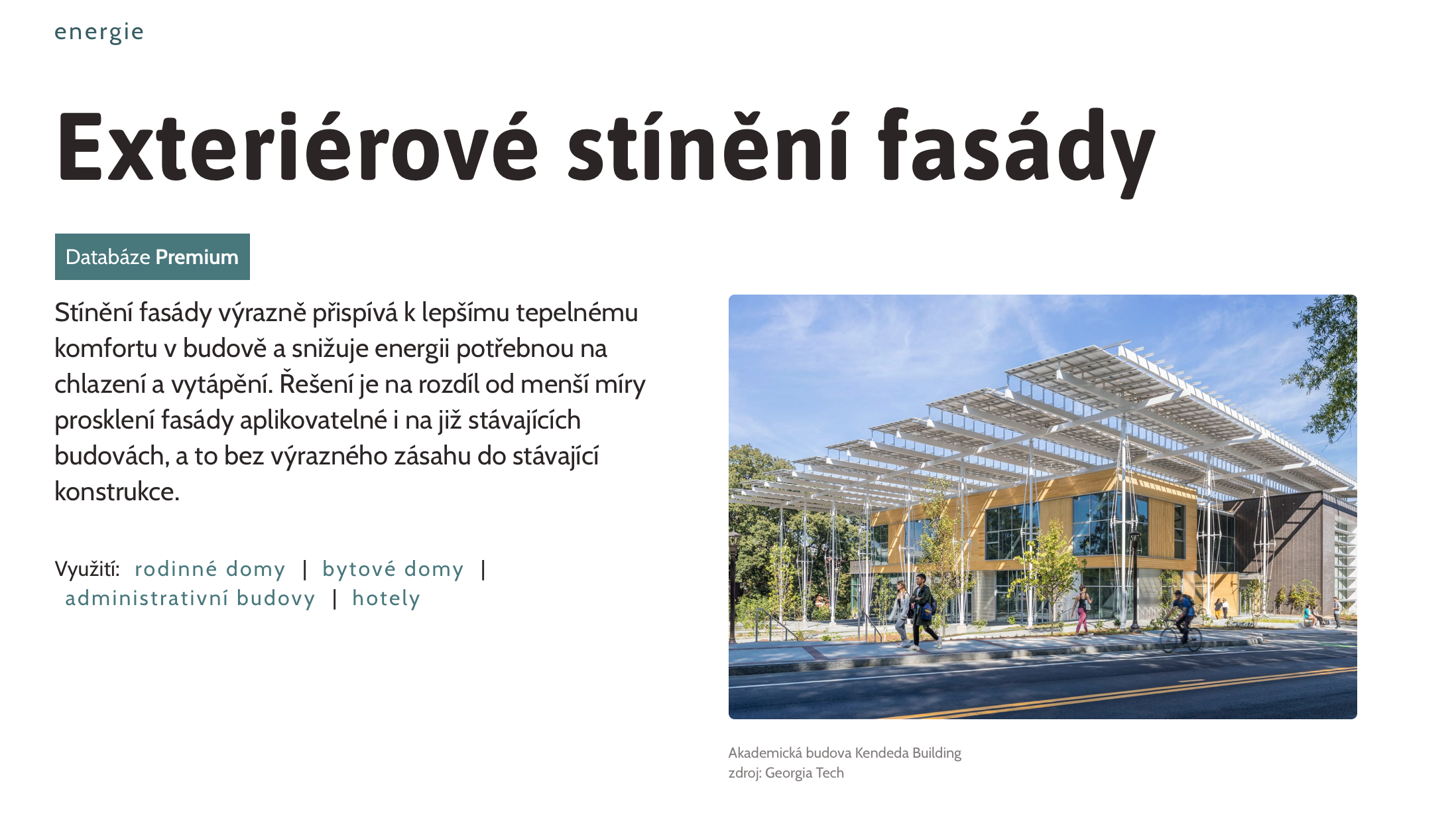 Databáze udržitelných řešení pro architekturu a stavebnictví nabízí informace o nejdůležitějších řešeních a technologiích pro ekologickou, finanční a sociální udržitelnost staveb. Najdete v ní přehled dodavatelů, výpočty investičních nákladů, case studies realizovaných projektů. Prakticky vám pomohou doporučené postupy pro realizaci udržitelných technologií vytvořené experty s certifikací BREEAM, LEED a WELL.