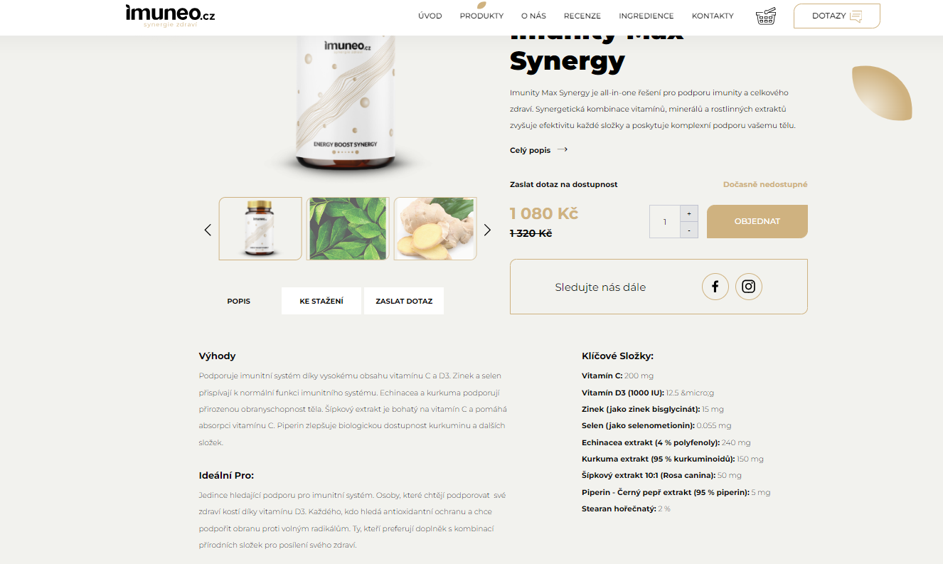 Imuneo.cz je inovativní startup zaměřený na vývoj a prodej vysoce kvalitních doplňků stravy, které využívají synergii přírodních složek pro maximální efektivitu. Naše produkty jsou navrženy tak, aby podporovaly zdraví, energii a celkovou vitalitu našich zákazníků. Zakládáme si na vědecky podložených formulacích a kvalitních surovinách. Naším cílem je stát se lídrem v oblasti doplňků stravy a přinést zákazníkům produkty, které skutečně fungují. S naší novou řadou produktů, jako jsou Immunity Max Synergy, Energy Boost Synergy a Gut Health Synergy, chceme přispět k lepšímu zdraví a kvalitě života každého jednotlivce.