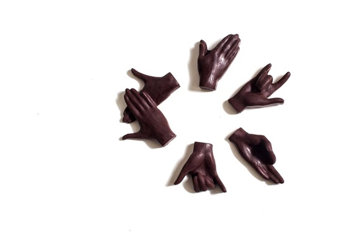 Skloubili jsme moderní 3D technologii a precizní jemnou práci sochařů, pod jejichž rukama vznikly formy pro odlévání zmenšených modelů rukou, které znakují. Každá ruka, každý znázorněný symbol, má vlastní význam ve znakovém jazyce. Tedy pokud budete pojídat čokoládu, budete se tak interaktivně učit novému jazyku.