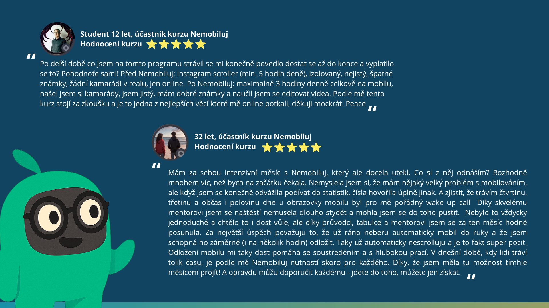 Představte si člověka, který tráví na telefonu několik hodin denně a uvědomuje si, že takto strávený čas by měl omezit. Telefon ale používá ke každodenním činnostem, má ho neustále po ruce a vlastní vůle mu k jeho omezení nestačí. Rady na internetu mu pomohou sotva na jedno dopoledne a nemají dlouhodobý efekt. Kamarádi nedokáží poradit a ani psycholog či adiktolog nenabízí systematickou pomoc. A právě proto, když má někdo problém s nadměrným užíváním telefonu, nepůjde k adiktologovi, doktorovi ani psychologovi, půjde k Nemobiluj - jedinému dlouhodobému řešení