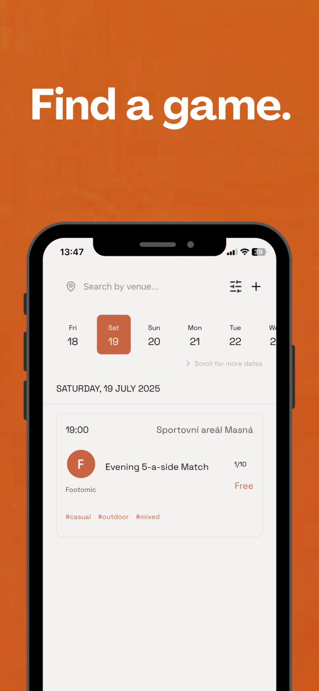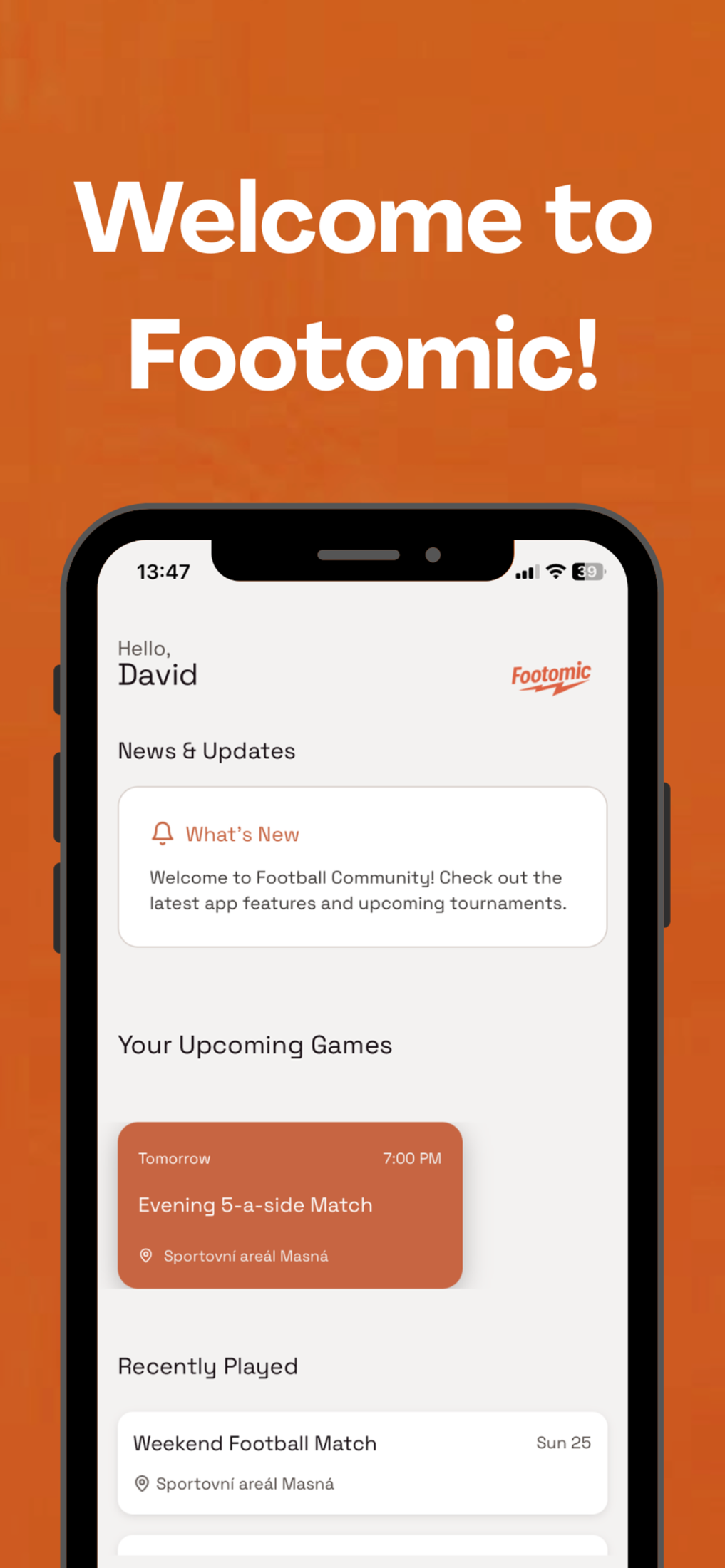 Footomic je komunitní mobilní aplikace, která spojuje lidi, co chtějí hrát fotbal, ale často jim chybí spoluhráči. Umožňuje během pár kliknutí založit nebo najít zápas ve vašem okolí, přidat se k ostatním a sdílet náklady na hřiště. Cílem je odstranit složité domlouvání, ušetřit čas a dát lidem možnost hrát fotbal častěji – kdykoliv budou mít chuť.