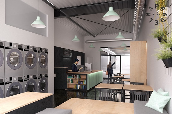 Prostory veřejné prádelny jsou navrženy v duchu jednoduché, funkcionalistické, baťovské architektury. Tato architektura je pro Zlín typická a dala městu nezaměnitelný ráz. Interiér Open space se vyznačuje prvky jako: velká okna v ocelových rámech, která jsou součástí budovy, beton, cihly, technické podlahy, jednoduchý nábytek, set praček a sušiček v šedém lakování.