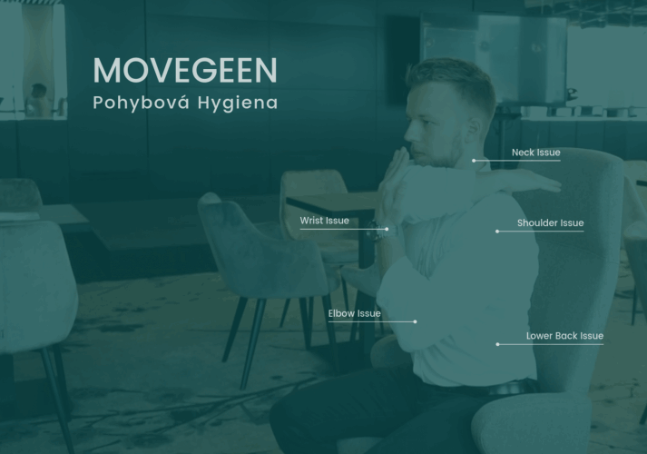 Movegeen (Pohybová hygiena) je platforma zaměřující se na boj se sedavým a neaktivním životním stylem. Většina z nás je dnes připoutána na židli před počítačem, což si postupně vybírá nemalou daň. Bolesti zad, krku a postupně celého těla. Nekonečné lítání po ortopediích a fyzioterapiích nás akorát ubíjí a výsledky nejsou vždy ideální… Doba se rychle vyvíjí a s tím i náš „nepohyb“. Bylo by potřeba mít fyzioterapeuta doma ideálně 24/7. Dlouhé čekací doby u lékařů a doba plná prášků proti bolesti nemůže zastavit naše sezení a hrbení se v průběhu celého dne a problémy s tím spojené. Jako rehabilitační fitness trenér jsem zjistil, že řešení nemusí být vůbec složité, vlastně je docela jednoduché. Movegeen je platforma poskytující:
